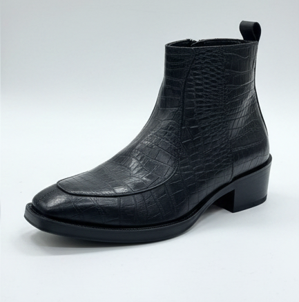 MEN’S BLACK EMBOSSED ANKLE BOOTS WITH SIDE ZIP AND BLOCK HEEL