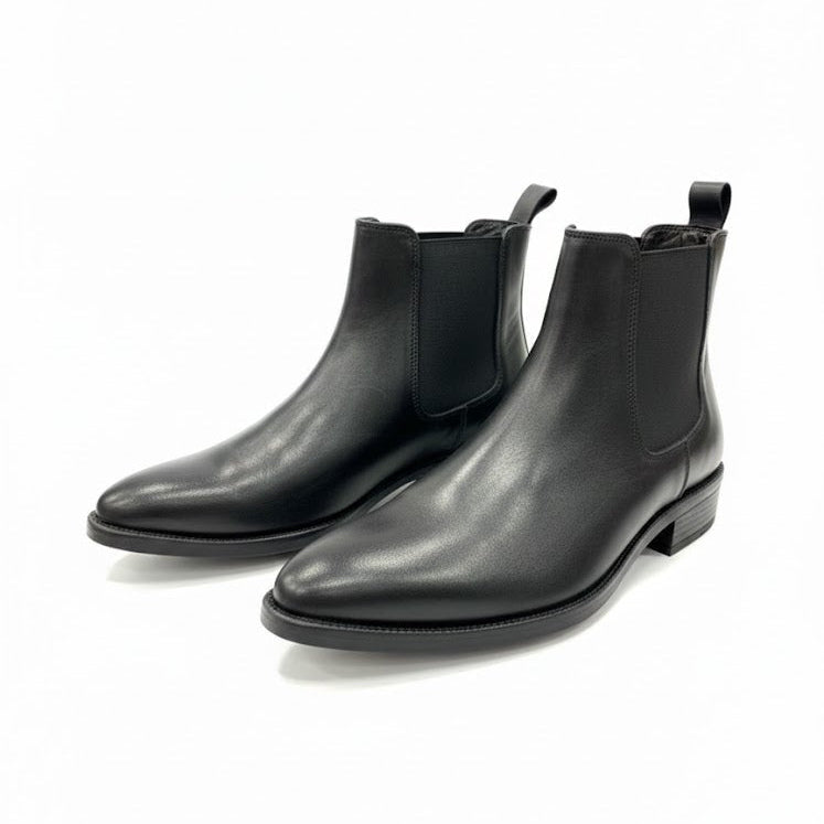 These black formal Chelsea boots feature a smooth and elegant design with elastic side panels for easy wear. They are comfortable, stylish, and perfect for office use, formal occasions, and smart casual outfits.